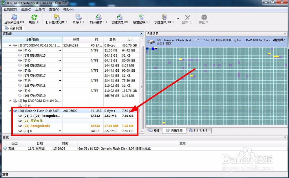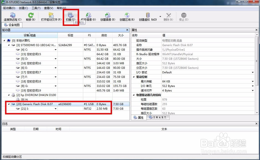 接著鼠標(biāo)點擊U盤的選項,然后在軟件上面的工具欄中選擇掃描選項,如圖所示: