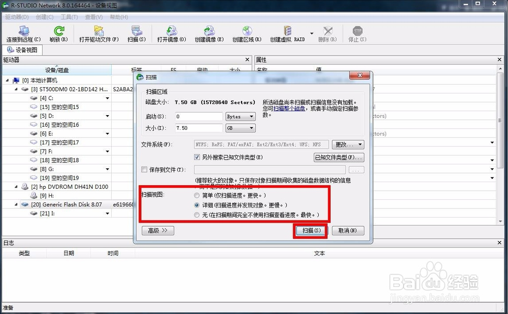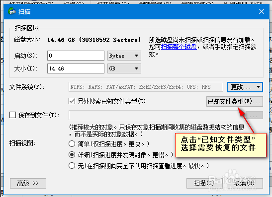 接著會彈出掃描的設(shè)置界面,這里會顯示磁盤的大小,在設(shè)置界面的下方會有個掃描視圖,分為三種情況,一種是簡單,只是掃描進(jìn)度,一種是詳細(xì),這個掃描起來比較慢,因為掃描啥都顯示,肯定慢,最后一種就是無,也就是啥也不顯示,直接后臺運行,這個當(dāng)然是最快的了,根據(jù)自己的情況選擇,選擇好后點擊掃描選項。