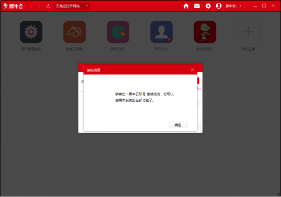 第四步:彈出提示框:恭喜您,犀牛帳號激活成功,您可以使用本系統(tǒng)的全部功能了。點擊【確完】成犀牛帳號激活(如圖四);