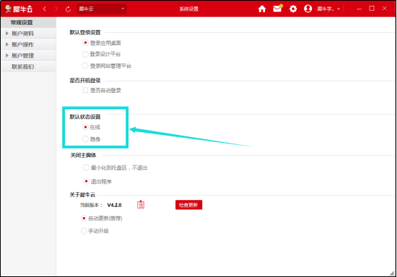 默認登錄狀態(tài)設置是指您犀牛云客戶端登錄后的顯示狀態(tài),分別有在線、隱身、兩種狀態(tài)選項;