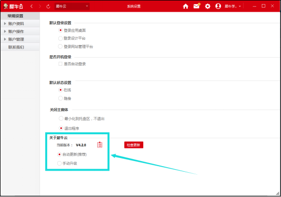 關于犀牛云您可以依據需求選擇自動更新還是手動升級犀牛云客戶端,設置完成后即可以應用這些設置;