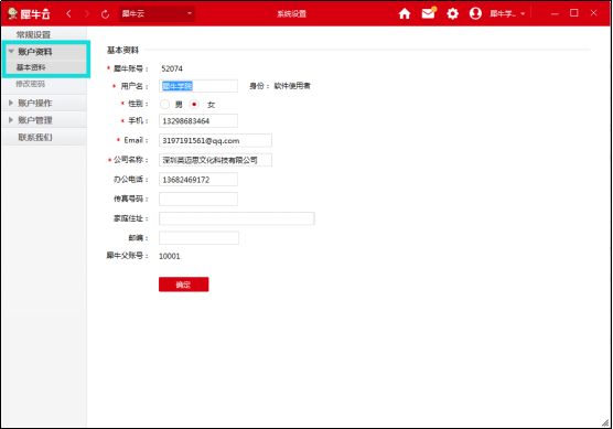 第四步:犀牛賬號基本資料編輯后,點擊【確定】彈出系統(tǒng)提示框,點擊【確定】完成資料的修改(如圖四);