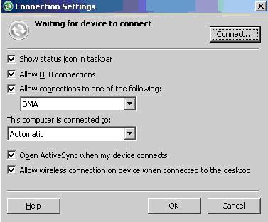 1. 安裝ActiveSync并運(yùn)行,在菜單中選擇File,然后選擇Connect Settings,按照下圖進(jìn)行設(shè)置: