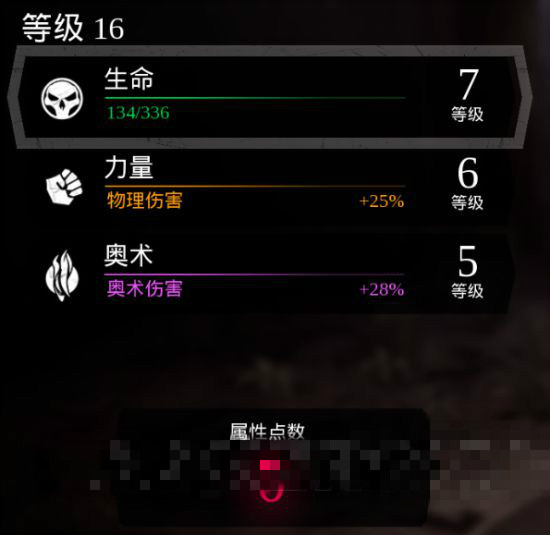 拿藍(lán)魂兌換屬性點(diǎn),獲得的屬性點(diǎn)可以自由加在生命、力量、奧術(shù)三處。其中力量代表物理攻擊,奧術(shù)包括閃避反擊、蓄力攻擊、神怒攻擊、暴亂形態(tài)的攻擊。
