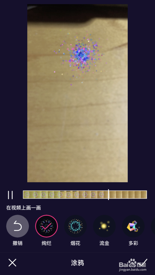 選擇好涂鴉樣式后,用手指點擊視頻預(yù)覽界面,這時候會自動生成涂鴉,且視頻在播放狀態(tài),這樣就添加成功了。
