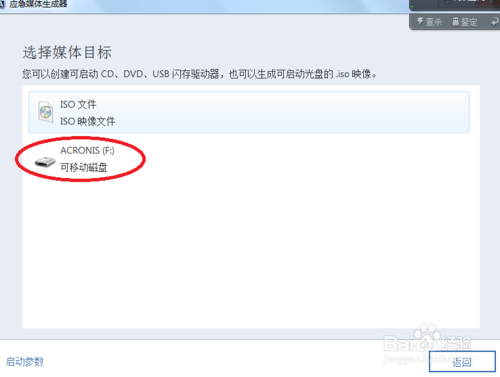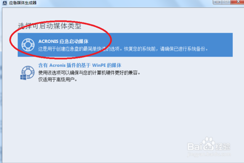 在上一步中點擊應(yīng)急媒體生成器,出現(xiàn)下面界面,點擊ACRONIS應(yīng)急啟動媒體,這個主要是用于創(chuàng)建應(yīng)急盤的最簡單快速的選項,