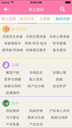 知識點滴—一站式提供從孕前,到孕期、生產(chǎn)、月子,以及0~10歲幼兒的知識講解。