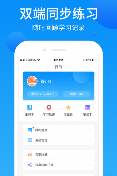電腦&APP全打通,一鍵同步學(xué)習(xí)記錄,生詞、錯(cuò)題隨時(shí)回顧。明細(xì)的錯(cuò)題記錄反饋功能,幫您了解自己的薄弱點(diǎn),錯(cuò)題可分類(lèi)重練,各個(gè)擊破。