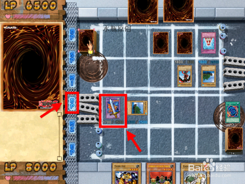 3.選擇完后,可以攻擊的牌上會出現(xiàn)一把劍,這時(shí)點(diǎn)帶有劍的牌,再點(diǎn)對方的牌(你想打的那張,如果對方?jīng)]有牌會直接攻擊對手)。攻擊結(jié)束后點(diǎn)擊鼠標(biāo)右鍵,可以選擇再放魔法/陷阱牌或者結(jié)束。