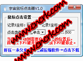 軟件本身小巧而使用又簡單,只需移動鼠標到需要點擊的位置再按下f1鍵立即自動點擊,有頻率可設(shè)置(單位:毫秒 1000毫秒=1秒),點擊f2鍵立即停止,簡單又實用。