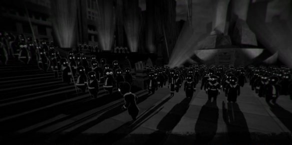 陌生人一遍走一遍回想著自己做的事,路邊全是一些空洞的眼睛正在注視著他,仿佛都在等待著這位陌生人的死亡到來。