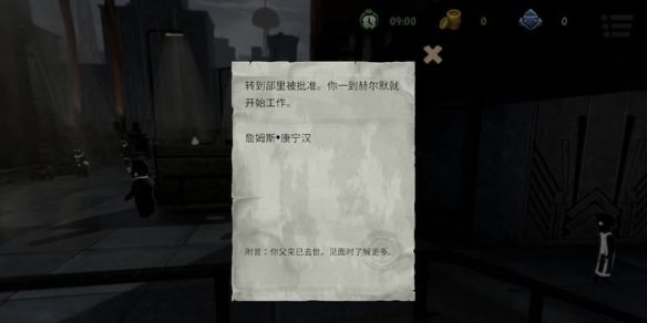 同時收到一封信,是來自一名叫詹姆斯·康寧漢的人送來的,這封信是關于玩家在政府部門工作的批準,另外從附言中我們可以了解到主角父親已去世。