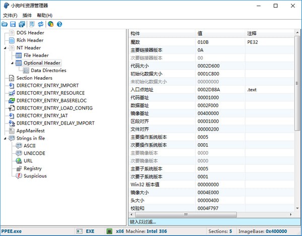 小狗PE資源管理器對于畸形和特別制作的 PE 文件是強大的,這對于逆向工程、惡意軟件研究和靜態(tài)檢查 PE 文件詳細信息的人員來說非常方便。支持包括導入、資源、異常、證書(依賴于 Windows API)、基址重定位、調(diào)試、TLS、加載配置、綁定導入、IAT、延遲導入和清理 PE 文件中的所有目錄。【功能介紹】