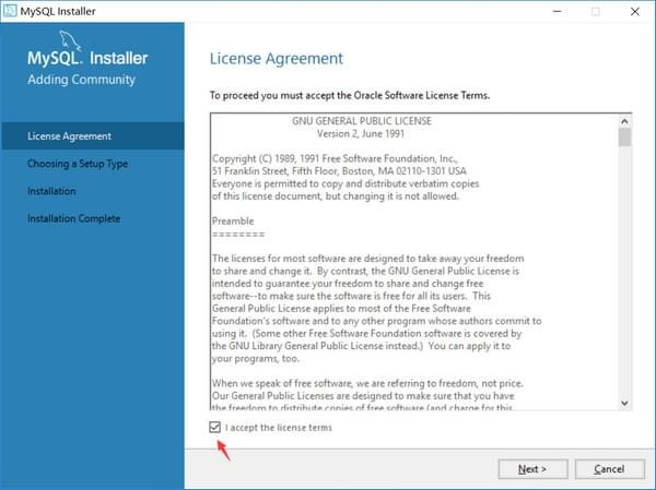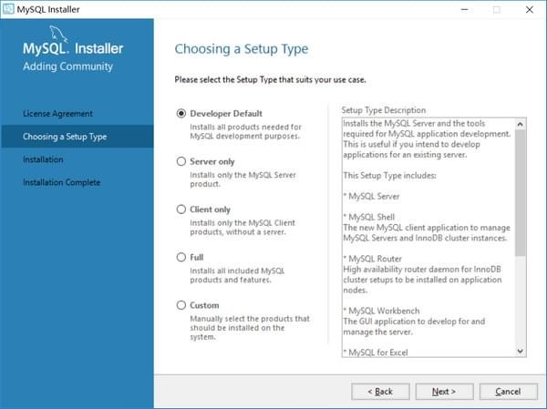 第一個(gè)選項(xiàng)包含了一些MySQL其他組件,如果只安裝MySQL數(shù)據(jù)庫(kù),選擇第二項(xiàng)Server only就行。這里我直接選擇默認(rèn)的Developer Default