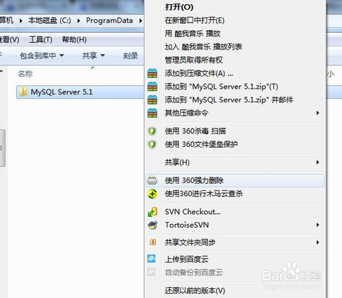 6、刪除C盤(pán)下的“C:\ProgramData\MySQL ”所以文件,如果刪除不了則用360粉碎掉即可,該programData文件是隱藏的默認(rèn),設(shè)置顯示后即可見(jiàn),或者直接復(fù)制上邊的地址到地址欄回車即可進(jìn)入!刪除后重啟電腦,重裝MYsql數(shù)據(jù)庫(kù)應(yīng)該就成功了。