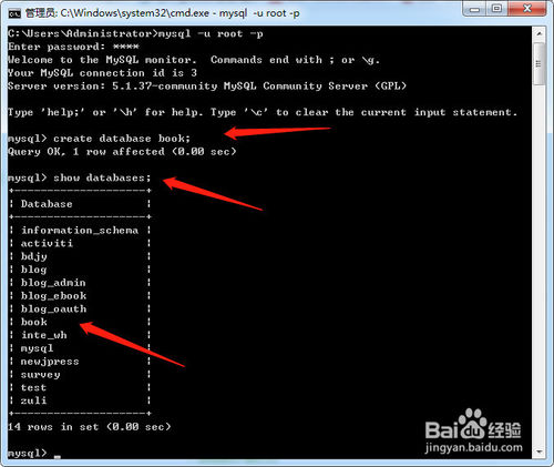 7、輸入create database book;命令,意思是創(chuàng)建名為book的數(shù)據(jù)庫(kù),創(chuàng)建成功之后在使用show databases命令,來(lái)查看數(shù)據(jù)庫(kù)列表