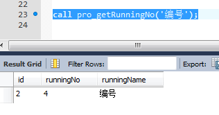 4、執(zhí)行存儲(chǔ)過(guò)程使用call命令,與SQL SERVER的exec用法一樣,執(zhí)行后發(fā)現(xiàn)了返回值,流水號(hào)已經(jīng)+1