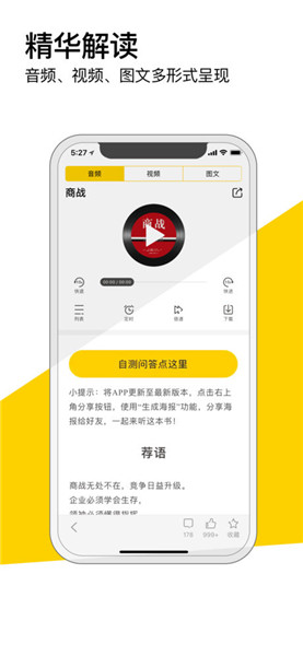 每年50本書,每周一本書,圖文、音頻、視頻全方位解讀經(jīng)典,閱讀無(wú)負(fù)擔(dān)!每本書濃縮成30分鐘的音頻視頻,讓您快速轉(zhuǎn)化為行動(dòng)指導(dǎo),運(yùn)用到實(shí)際中去。