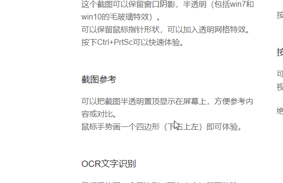 可以把截圖半透明置頂顯示在屏幕上,方便參考內(nèi)容或?qū)Ρ取?br />鼠標(biāo)手勢(shì)畫一個(gè)四邊形(下右上左)即可體驗(yàn)。