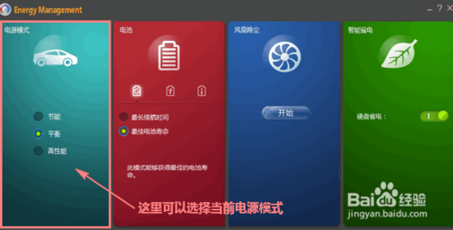 打開“聯(lián)想電源管理”的主界面后,我們可以看到整個軟件將功能劃分為四個區(qū)域。最左的第一個區(qū)域“電源模式”的作用是設(shè)置當(dāng)前電源模式,總有三個選項(xiàng):