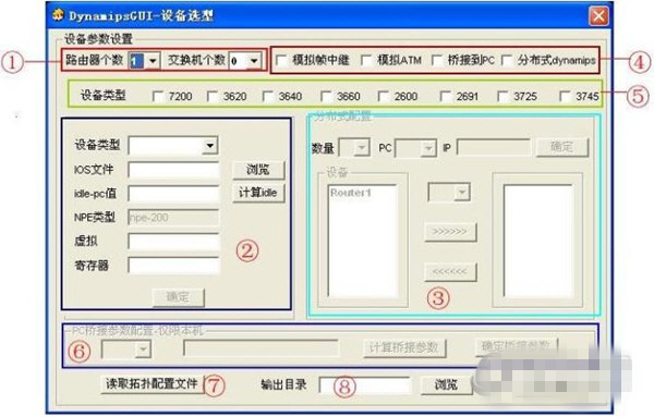 ①:此區(qū)域是選擇交換機(jī)和路由器的個(gè)數(shù)(有點(diǎn)廢話)②:這個(gè)地方是選擇設(shè)備類型,IOS路徑,idle-p值NPE類型,虛擬(表示虛擬設(shè)備的RAM所占的內(nèi)存大小,因?yàn)閐ynamips在模擬時(shí)候需要將主機(jī)的物理內(nèi)存模擬成模擬設(shè)備的RAM)