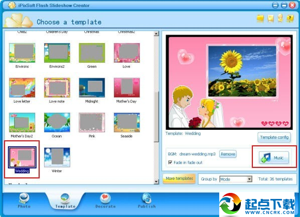 Flash幻燈片創(chuàng)建器提供了59個(gè)免費(fèi)的預(yù)設(shè)Flash幻燈片模板,用于制作數(shù)碼相冊(cè),縮略圖庫(kù),flash照片幻燈片,flash橫幅等。在這里,我為Flash幻燈片選擇“Wedding”模板。
