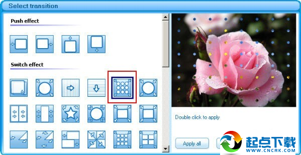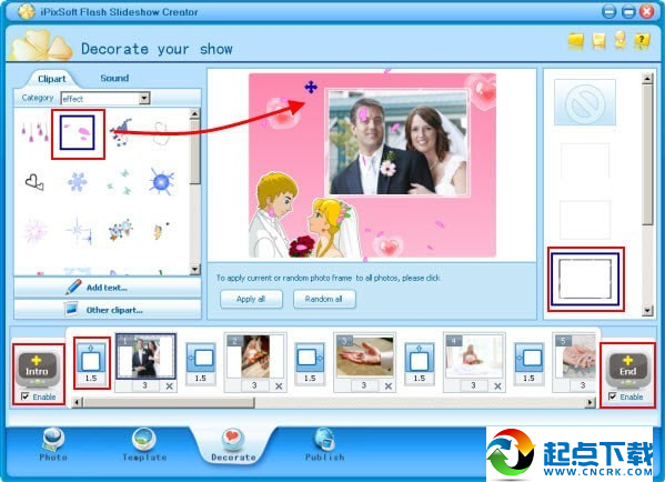 Frist 裝飾Flash幻燈片,為閃光幻燈片放映設(shè)置“簡(jiǎn)介和結(jié)束”,如果不喜歡,則禁用它們。其次,單擊效果框以從70多種過(guò)渡效果中選擇包括快速和推動(dòng)效果,以使幻燈片更加生動(dòng)。您可以選擇每個(gè)幻燈片效果并設(shè)置過(guò)渡和照片持續(xù)時(shí)間,或?qū)λ谢脽羝瑧?yīng)用相同的過(guò)渡效果。然后,為每張幻燈片選擇相框或?qū)⑵鋺?yīng)用于所有幻燈片。最后,拖放剪貼板以裝飾幻燈片。