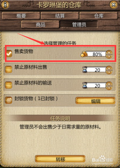 2.勾選售賣(mài)貨物選擇項(xiàng),價(jià)格后面的數(shù)值設(shè)為80%,相當(dāng)于80%的價(jià)格賣(mài)出去。方便的是只要超倉(cāng)就能賣(mài)出,也是為了防止超倉(cāng)后管理費(fèi)更貴