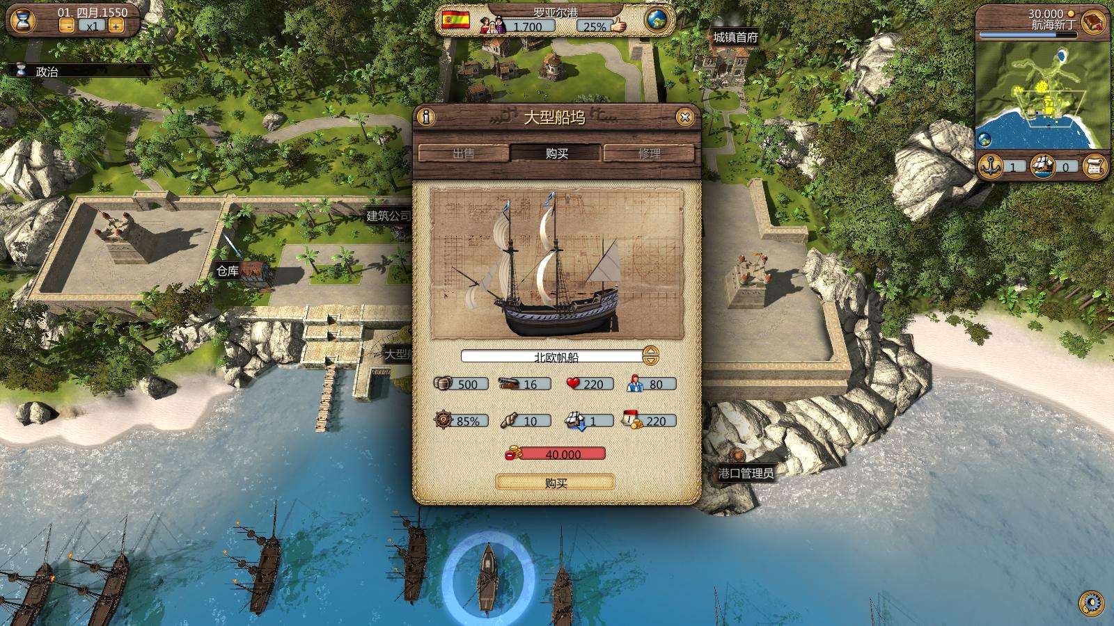 你是從哪個(gè)國(guó)家手里接管或搶奪的城市,這個(gè)港的船廠就賣(mài)這個(gè)國(guó)家的船只,所以你要想買(mǎi)50炮班輪,最好是從英國(guó)手里得來(lái)的城市。建擴(kuò)建成大船廠。