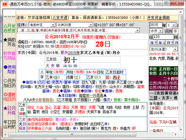 通勝萬年歷是個通勝日歷,包含前4800年到10000年共10480年的公歷,農(nóng)歷,回歷,八字,擇日神煞,周易預(yù)測,時辰吉兇,命理,易理,干支,節(jié)氣,日月食,星座,歷代年號,節(jié)日(含九九,3伏,梅),儒略日等等。古代部份與林道心《中國古代萬年歷》、陳垣《24史朔閏表》和張培瑜《3500年歷日天象》核對??梢哉f是也是精度高的歷算程序;擇日參考《洪潮和通書》。以后還會改進(jìn)。