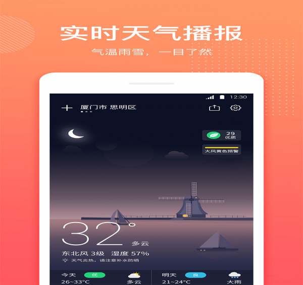 顯示當(dāng)日實時的天氣預(yù)報,溫度、濕度、風(fēng)速、氣壓等一一為你呈現(xiàn);日落日出的時間,天氣預(yù)報狀況等提示