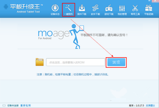 4、點(diǎn)擊一鍵刷機(jī),點(diǎn)擊瀏覽,打開文件目錄,找到剛才下載的固件;