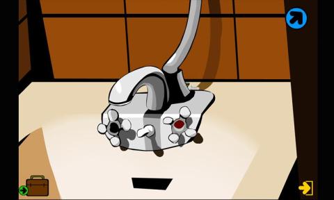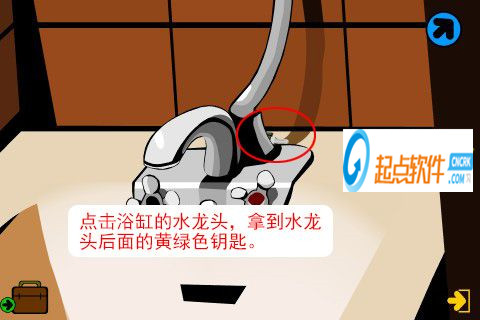 17、點擊浴缸的水龍頭,拿到水龍頭后面的一把黃綠色鑰匙。離開臥室的洗手間,再離開臥室(觸發(fā)劇情,神秘人放出來籠子中的狗)。