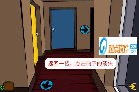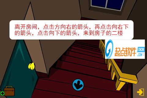 8、離開房間,點擊方向右的箭頭,再點擊向右下的箭頭,點擊向下的箭頭,來到房子的二樓。