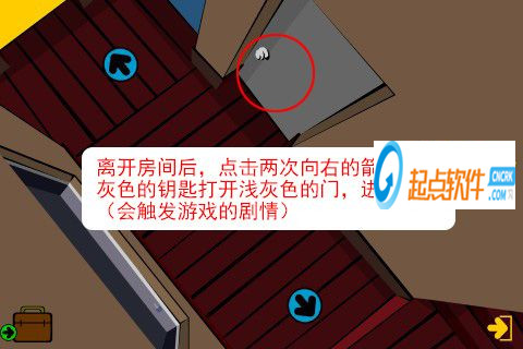 14、離開房間后,點擊兩次向右的箭頭,用淺灰色鑰匙打開淺灰色的門,進(jìn)入臥室(會觸發(fā)游戲的劇情)。