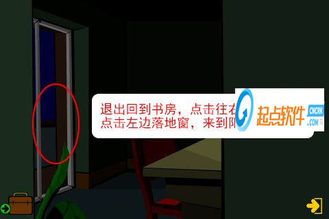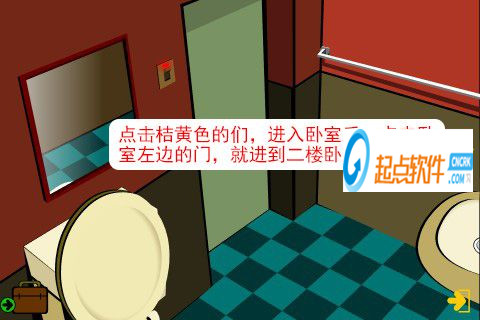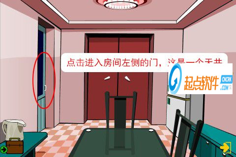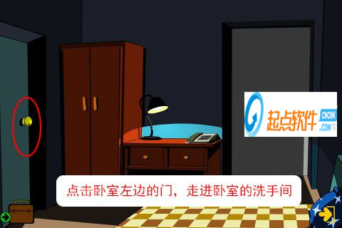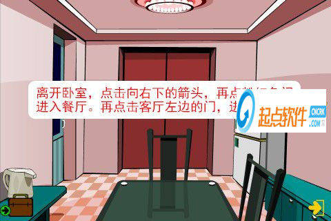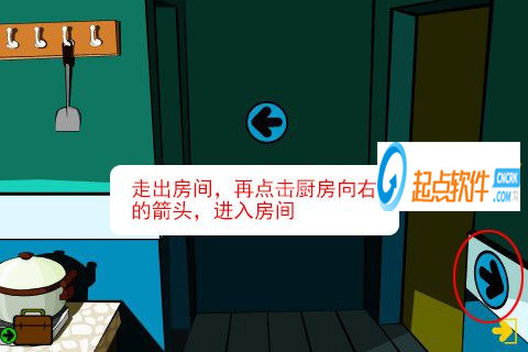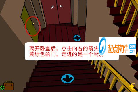 21、走出房間,再點擊廚房向右的箭頭,進(jìn)入房間(觸發(fā)劇情,一扇門的門把手壞了)。