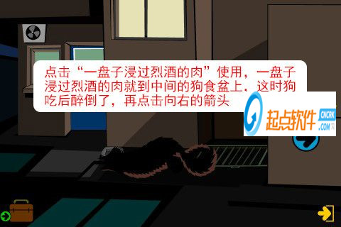 25、點擊“一盤子浸過烈酒的肉”使用,一盤子浸過烈酒的肉就到中間的狗食盆上,這時狗吃后醉倒了,再點擊向右的箭頭。