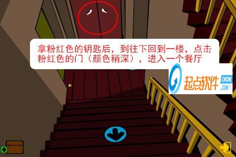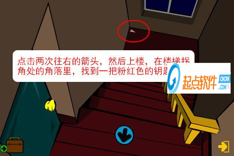 27、點擊兩次往右的箭頭,然后上樓,在樓梯拐角處的角落里,找到一把粉紅色的鑰匙。