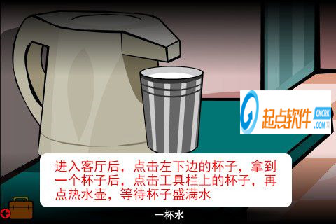 29、進(jìn)入客廳后,點擊左下邊的杯子,拿到一個杯子后,點擊工具欄上的杯子,再點熱水壺,等待杯子盛滿水。