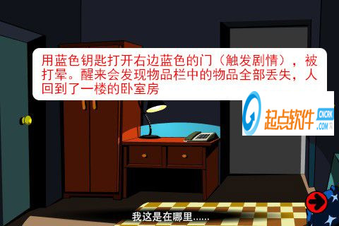 33、用藍(lán)色鑰匙打開右邊藍(lán)色的門(觸發(fā)劇情),被打暈。醒來會發(fā)現(xiàn)物品欄中的物品全部丟失,人回到了一樓的臥室房。