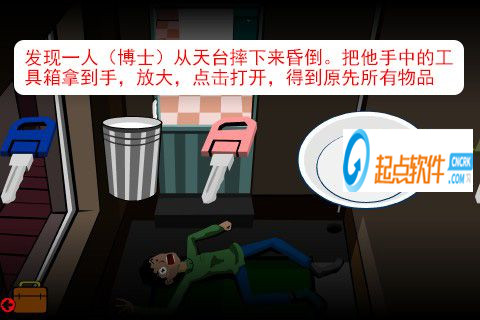35、發(fā)現(xiàn)一人(博士)從天臺摔下來昏倒。把他手中的工具箱拿到手,放大,點擊打開,得到原先所有物品。