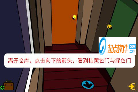 46、離開倉庫,點擊向下的箭頭,看到桔黃色門與綠色門。