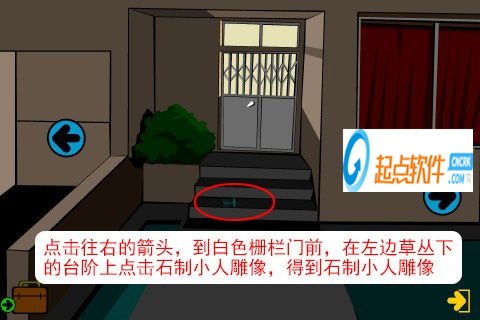 53、點擊往右的箭頭,到白色柵欄門前,在左邊草叢下的臺階上點擊石制小人雕像,得到石制小人雕像。