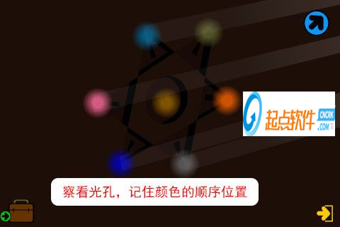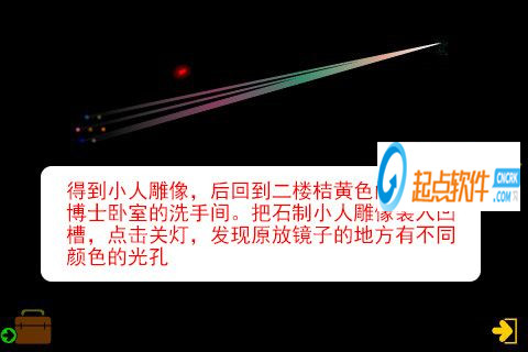 54、得到小人雕像,后回到二樓桔黃色門,進(jìn)入博士臥室的洗手間。把石制小人雕像裝入凹槽,點擊關(guān)燈,發(fā)現(xiàn)原放鏡子的地方有不同顏色的光孔。