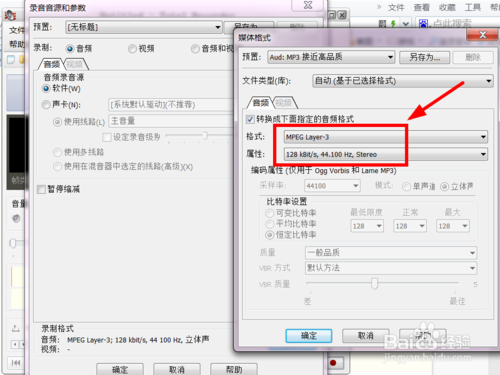 4.我們可以設(shè)置他的相關(guān)設(shè)置,如聲音mp3的格式等,一般我們選128kb就可以了;