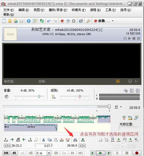 6.這時想要剪輯的音樂的波形圖就被選中了,點擊“選擇區(qū)另存為”按鈕進行另存為。