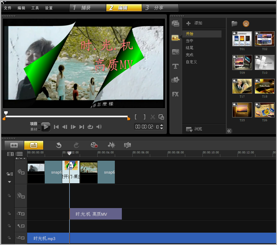 第五,編輯完成之后,在會(huì)聲會(huì)影中文版音樂軌道,即有個(gè)音符的那條軌道中添加你選擇的MV音樂。