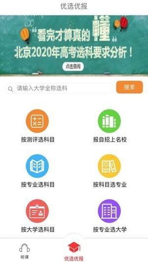 優(yōu)選優(yōu)報(bào)APP主要用于新高考選科測(cè)評(píng),用戶可以通過(guò)6個(gè)版塊,分別實(shí)現(xiàn)科目,專業(yè),大學(xué)的搜索結(jié)果。6大功能分別為:按測(cè)評(píng)選科目,按專業(yè)選科目,按科目選專業(yè),按就業(yè)選專業(yè),按分?jǐn)?shù)選大學(xué),按專業(yè)挑大學(xué)。