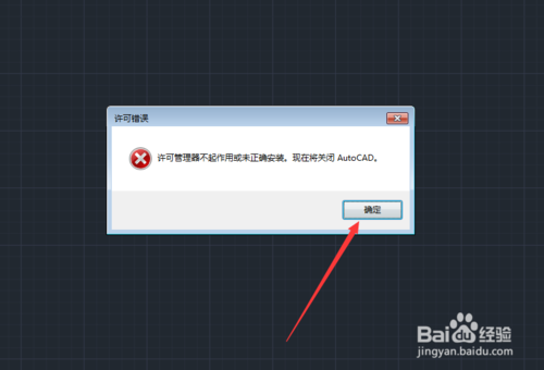Autocad2019許可管理不起作用或?yàn)檎_安裝?在桌面雙擊快捷方式圖標(biāo)打開(kāi)軟件,打開(kāi)后馬上彈出下圖提示將代表軟件暫時(shí)不能使用點(diǎn)擊確定將退出軟件,再次打開(kāi)還是一樣的結(jié)果,如圖所示。