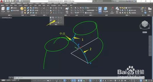 利用“打斷于點(diǎn)”的命令,將圓弧1與2分別于中心點(diǎn)打斷